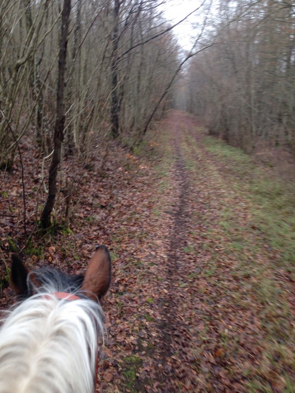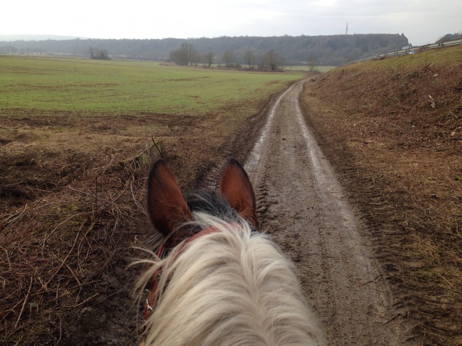 Il y a du vent , des orages qui grondent au loin , des motocross qui nous tombent dessus a la sortie d un virage ( et qui vont nous poursuivre un bon moment ) , des lapins qui détalent , des gosses qui déboulent de derrière une voiture en courant et criant ( juste au moment où je prenais une photo , j ai cru perdre le téléphone ...) .... mais malgré ça , un top poney adorable . Ca regarde et Ca sursauté un peu , mais surtout très ã l écoute malgré les conditions .