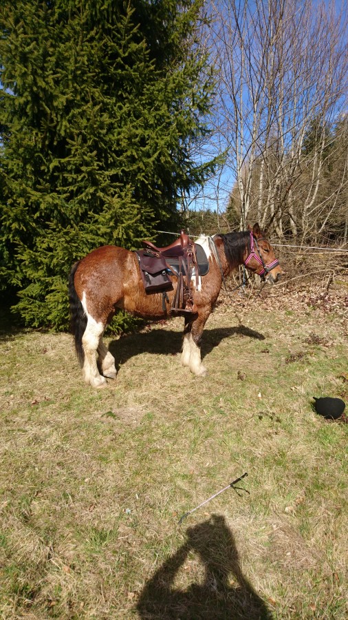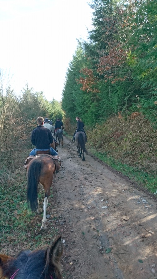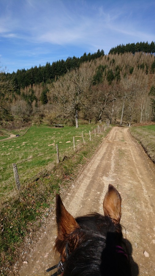 Il était super motivé mais on est resté au pas, les chemins sont glissants. J'ai pris des endroits où on va pas trop mais qui suivent la route habituelle même s'ils n'aboutissent à rien pour la plupart, j'me suis bien amusée à faire du tout terrain ^^ On a galopé dans une petite montée pour changer de d'habitude et arrivée au bout, big écart à cause d'un chien qui sautait furieusement sur la grille