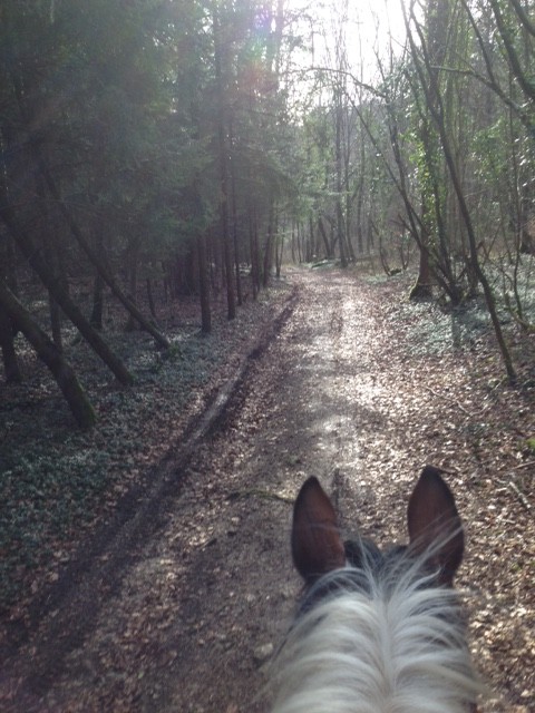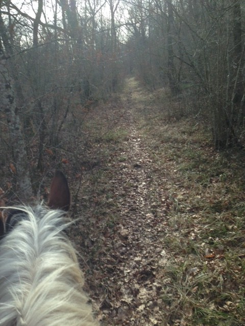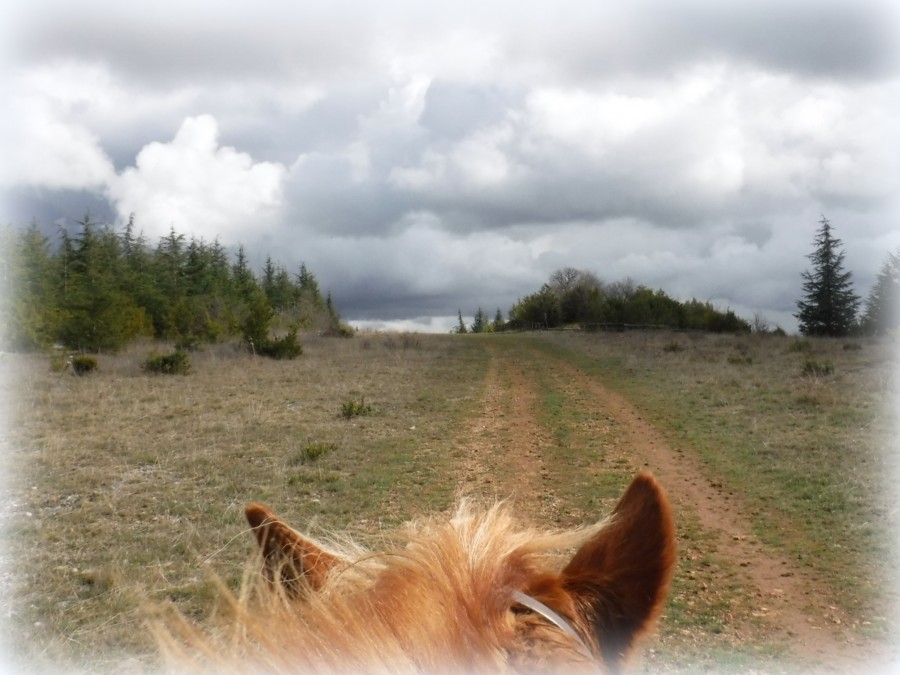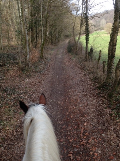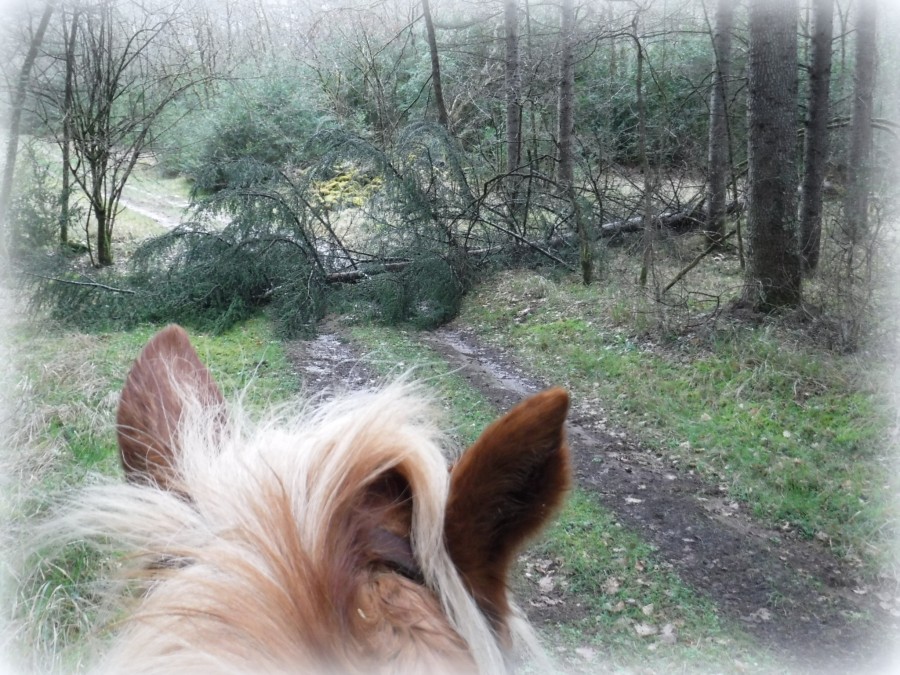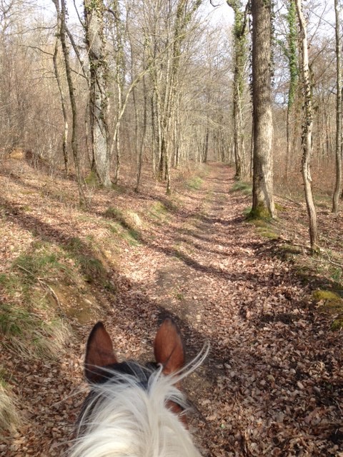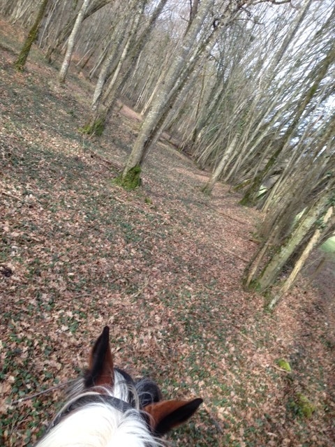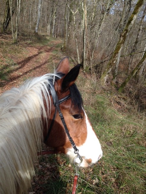 Je suis allée un peu l'assouplir dans le manège pendant que la dernière cavalière sellait, et go. On a fait un peu moins de 15km et Perle était TRES en forme. Elle a même sauté deux fois au dessus de troncs, et je la sentais super contente d'y aller (yeehaaaa!). Ca ne me dérange pas de la laisser un peu s'amuser parceque je sais qu'elle ne buckera jamais. Mais seule je la laisse plus volontiers s'amuser qu'accompagnées, là, j'ai dû pas mal la freiner. A un moment d'ailleurs elle est partie au galop au lieu du trot à l'occasion d'un virage, j'ai pas stoppé de suite parceque ça allait aux copines qui me suivaient mais quand j'ai voulu la faire ralentir, mademoiselle ne voulait vraiment pas!! Elle a fini par entendre raison, mais quand même au bout de quelques dizaines de secondes, et limite frustrée la mamie. C'était la plus âgée des trois juments et surtout la plus petite, avec une Irish et une grande SF, et pourtant elle était loin de se faire distancer, c'était même plutôt l'inverse.