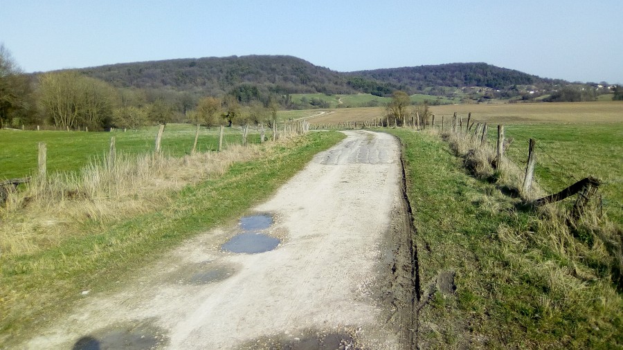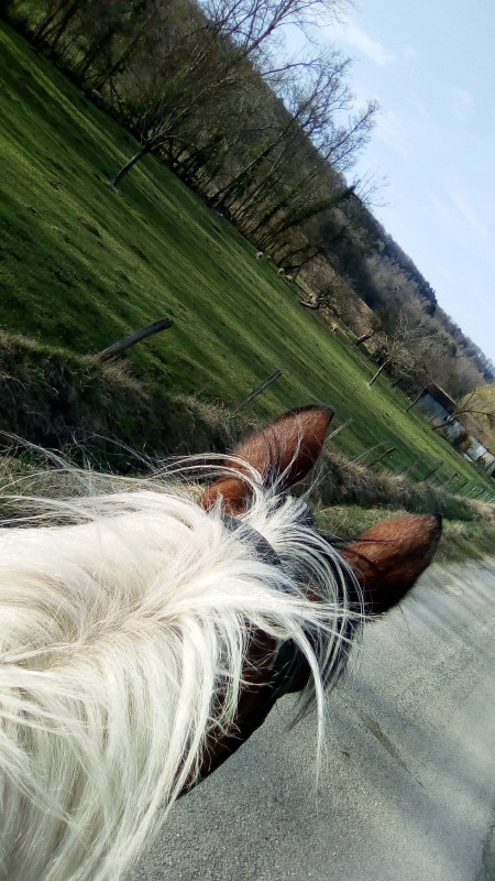 Et on part ! Pas très motivé. Îl marche loinnnn derrière moi . Mine de rien , essaie de faire 1/2 tour ou de brouter .