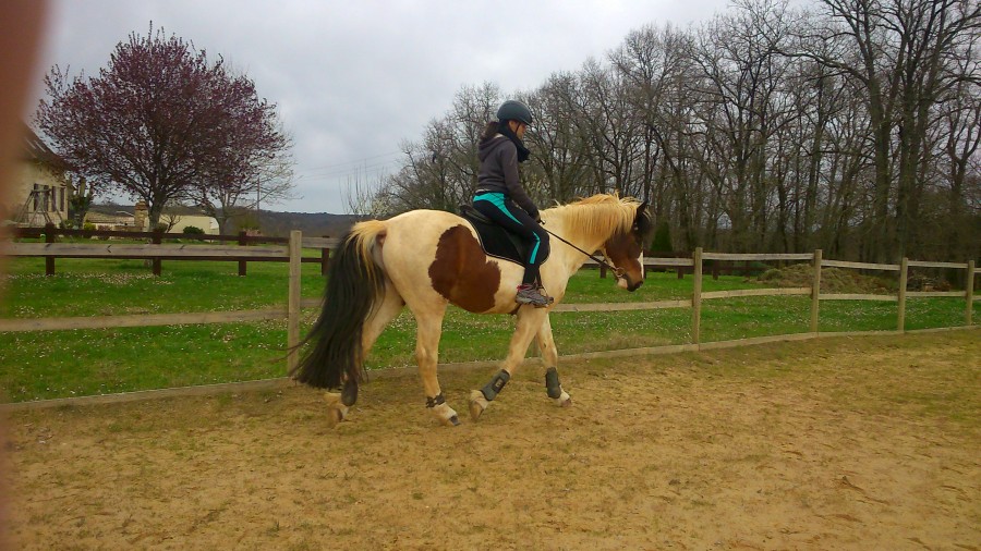 Et puis, gros bonus pour l'avancée du travail avec Pot', j'ai testé le mors, uniquement le mors, sans filet. C'est magique. Quelques réglages à faire pour conserver la bonne tension sans l'enfermer et lui laissant machouiller... J'ai eu une bonne surprise quand, au galop, j'ai voulu relacher la tension et que je n'avais plus rien au bout des renes, enfin si, juste le mors pendant autour de son encolure