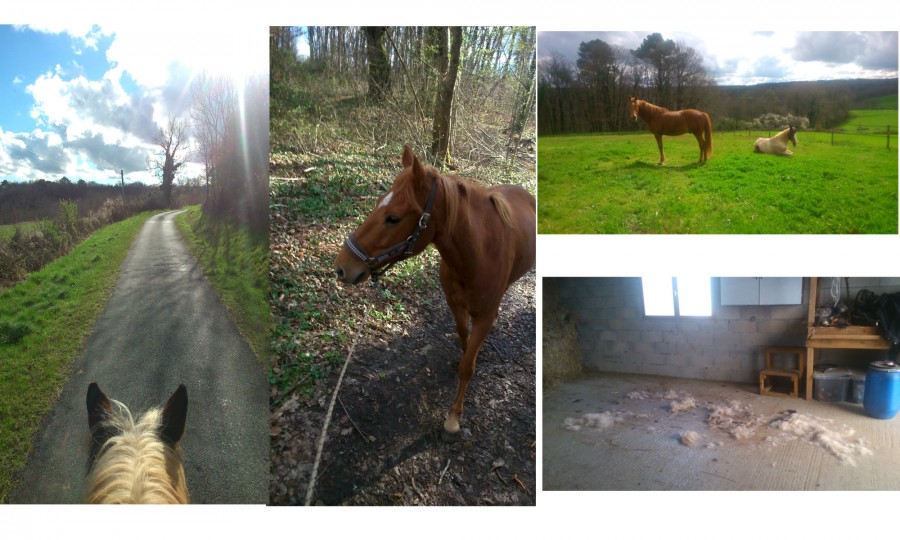 Petit trot en chemin qui se passe bien, sur le retour je demande le trot et je sais que le chemin est top, je laisse avancer... Et je me fais emmener ! Par Pot' qui a complètement craqué et qui m'a sorti un galop qu'on a rarement ! Et First qui suit sans soucis... J'étais pas rassurée là-haut !