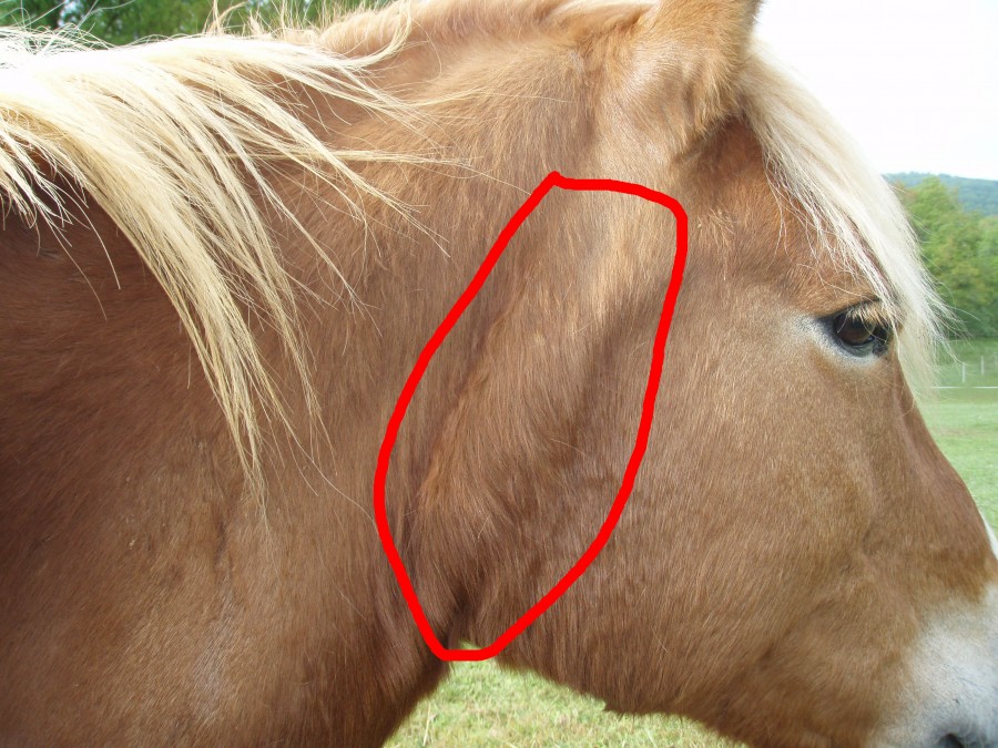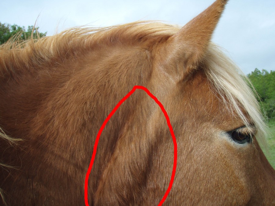 En fait elle a des grosseurs type "ganglions" mais taille cheval, quoi, juste au point de rencontre l'arrière de la ganache et de la gorge. Cf l'ovale rouge. C'est pareil de chaque côté, et c'est à peu près cette taille, peut être un poil plus haut, mais guère. Ca n'a pas l'air douloureux... Ce sont peut être bêtement des ganglions un peu gonflés à cause de la mycose ou du temps...