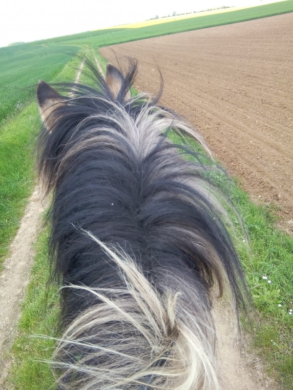 En plus, elle était maladroite, à force de regarder partout elle regardait pas devant. ça j'ai l'habitude mais là c'était pire, je pouvais donc pas laisser rênes longues, fallait lui montrer où poser ses sabots.