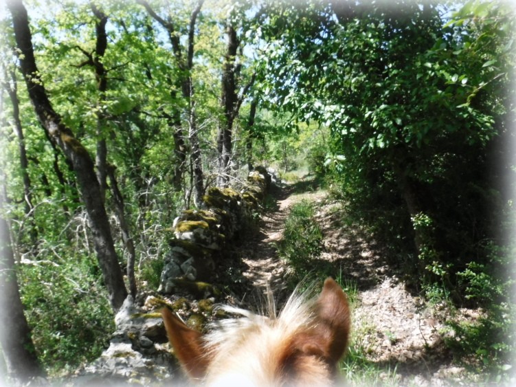 Mais on a fini par arriver là où j'avais repéré un petit sentier chouette, mais boueux, en arrivant à la pension. Hop nous voilà à le tenter. C'était étroit, sinueux, et bas de plafond ! Bien contente d'avoir ma crevette d'1m40, j'ai souvent fini sur l'encolure. On a longé la rivière... c'était joli...