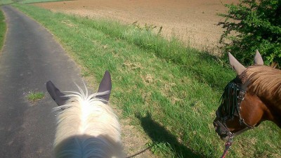 Le top du top serait d'avoir un autre couple cavalier-cheval pour faire une première sortie, mais ce n'est pas toujours aisé à trouver. Mais même seuls vous pouvez y arriver. Tu peux partir d'abord à pied, tu l'équipes juste, tu prends ton casque, et vous partez tranquilles ; puis au bout d'un moment tu fais demi-tour et tu fais le retour en selle. C'est positif : la cavalière c'est pour rentrer à la maison, c'est cool.