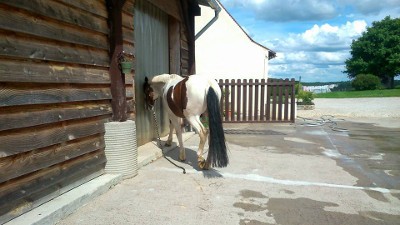 Alors, je le sors de son pré puis je le ramène à ma sellerie où je l'accroche à un anneau.