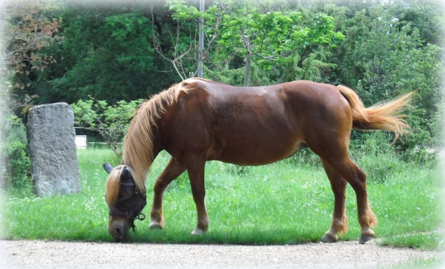 Petite balade avec Daisy, un peu plus lente mais je pense que ses pieds commençaient à la gêner. Elle avait les sabots dans un sale état! larges et cassants, on a essayé de limiter les dégats. j'espère que le maréchal passera bientôt et surtout qu'il voudra bien la faire, car elle se laisse reposer quand elle donne les postérieurs, ce qui n'est pas rien vu le format!