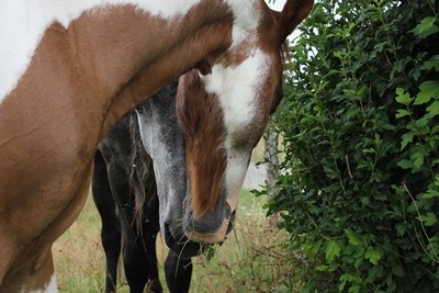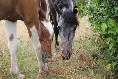 Ils ont trottés et couiné un bon moment. Apache étant sûr de son bon droit, il s'est imposé en moins d'une minute. Apache n'étant pas un dominant tyrannique, ils se sont vite mis à manger de concert. Certainement heureux d'avoir de l'herbe jusqu'aux genoux et un chef sur lequel se reposer, Salbaï s'est mis à coller Apache comme un poulain le ferait avec sa mère. C'est assez drôle à voir parce qu'il est quand même un peu grand ce poulain. Ces premières émotions passées, je suis devenue un sujet de curiosité, de même que l'abri, ainsi que l'abreuvoir et les poules et moutons du pré d'à côté. Il a de quoi s'occuper pour quelques jours, sachant qu'il y a encore deux parcelles à découvrir pour plus tard car le pré est coupé en trois...