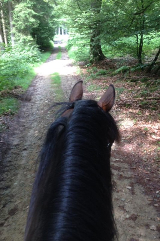 Puis en plein milieu du bois, on venait on de terminer un trot, on était de retour au pas tranquille, et d'un coup il s'est figé en regardant vers la droite (dans la brousse), et je ne sais pas, un gibier, une odeur, un bruit, ça l'a vraiment mis en panique, il s'est figé volte face pour faire demi-tour et galop avec coups de cul.