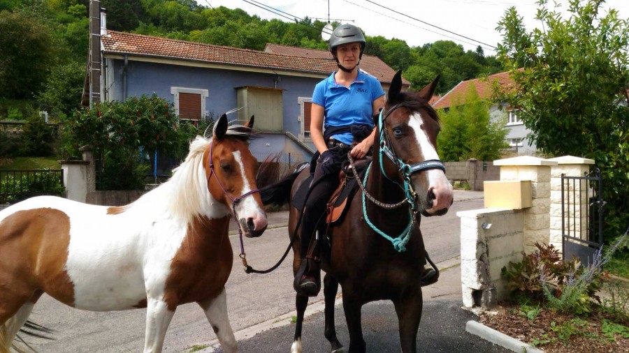 On est parties pour un tour actif, à trotter et galoper dès que possible avec 2 chevaux mignons comme tout, Pot' fidèle à lui même et First joueur pour ne pas changer : tête entre les antérieurs, sauts de mouton dès qu'on démarre ! Joueur et content de vraiment galoper en extérieur mais sans aucune volonté de jeter la pauvre cavalière à cru là-haut. Bon, il fallait quand même s'accrocher mais j'en ai vu d'autres, ça m'a plus fait rire qu'autre chose. Moi jeune et inconsciente ? Mais noooon