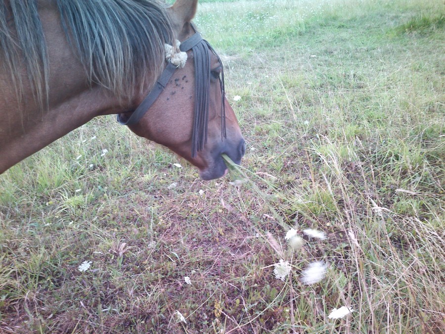 Heureusement, on a croisé une jeune fille à vélo qui a pu le récupérer facilement, mais sinon, je n'aurais pas été plus inquiète que ça, sauf pour la route à traverser. Je l'ai gardé en longe et une fois que la route était passée je l'ai laissé rentrer en liberté, devant First et moi, jusqu'à la maison, le chemin étant bien délimité des deux côtés et ne menant que chez nous. Il a marché exactement aux mêmes endroits que d'habitude, à son allure tranquille, sans s'arrêter pour grignoter... Juste comme ça.