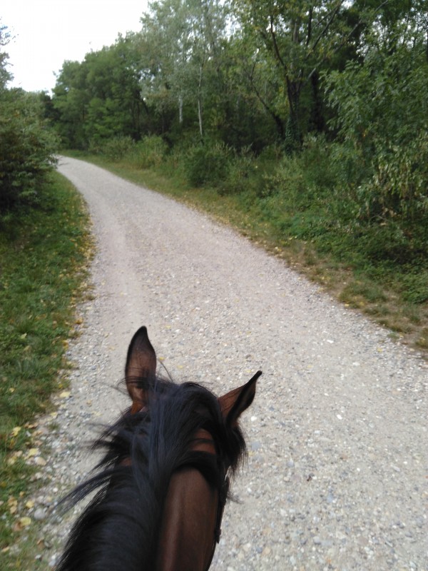Çe matin on a remis Ca avec D et son étalon . Temps très lourd ce matin = chevaux pas très motivés . On a fait un tour moyen , même pas 4 km . Tout au pas , puisque l étalon reprend toujours .