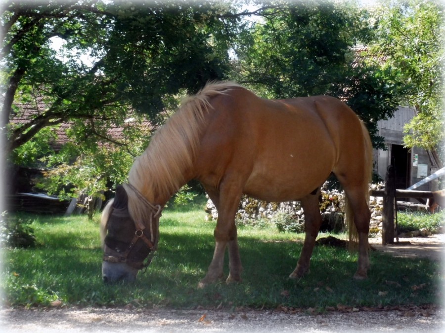 On a remonté la moitié du halage au trot, puis un petit bout au galop, on a marché en prenant à gauche, et on a regalopé un coup, mais on a stoppé car le poney commençait à ruer. Puis on a retrotté sur un petit chemin (beaucoup plus loin, entre temps on a papoté au pas tranquille) et alors là ! Peur de la vie de la jument !!! Un vélooooo