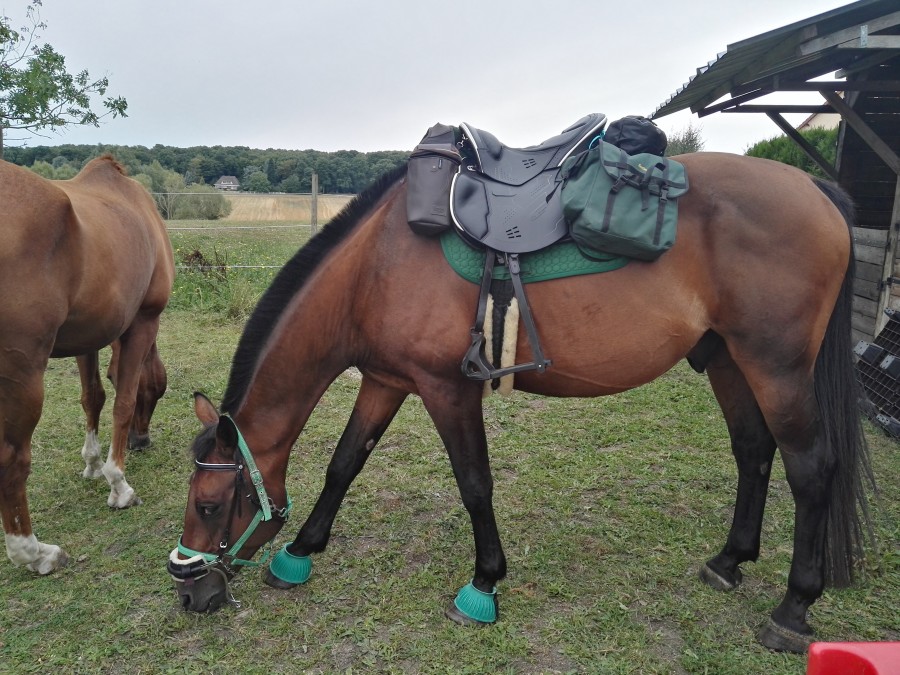Breef, il déboulait à fond de la gauche et nous on arrivait tout droit, heureusement il a pilé, mais du coup grosse flippe avec le bruit de freins pour les chevaux ! Bon ensuite plus de soucis, on a croisé plein de vélos sans problème, on a refait un tout petit trot, et on est rentré à côté au pas. J'ai une photo mais sur on téléphone et c'est trop galère...