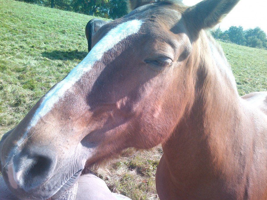 ;puis je suis monté ;puis juste après ça à failli partir en "cacahuette" ,car les 4 sont parties au galop (Mia en premier d'ailleurs :"peur" est-ce qu'elle a voulu s'echapper ???" Donc j'ai du faire une rêne d'arrêt d'urgence (je n'avais pas mis le mors car comme on restait dans le parc ,j'avais juste mis le licol ) et bien ça marche (c'est quand même rassurant ; je n'avais pas encore testé pour de vrai !! Ben elle a tourné mais pas eu de coups de culs ni rien ;puis les autres se sont calmées et on a quand même eu un petit galop pour les "rejoindre" mais sans "variantes" donc au galop j'etais pas trop mal à l'improviste .