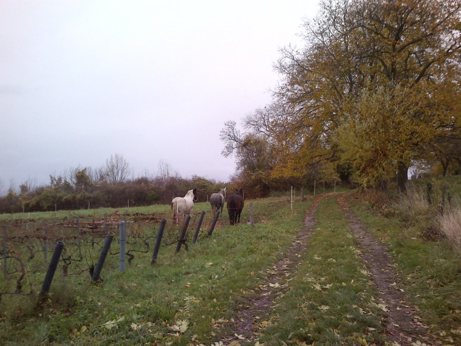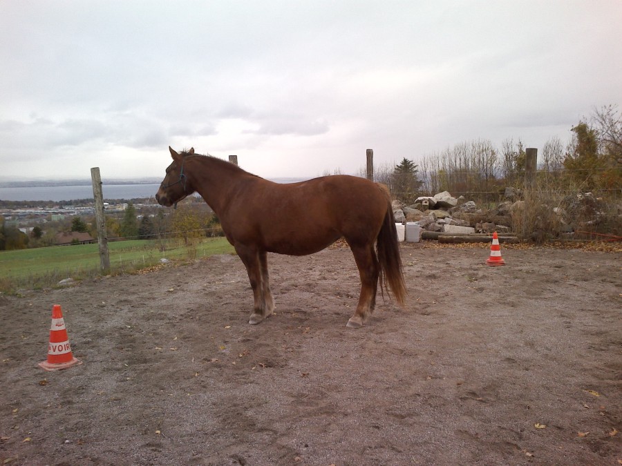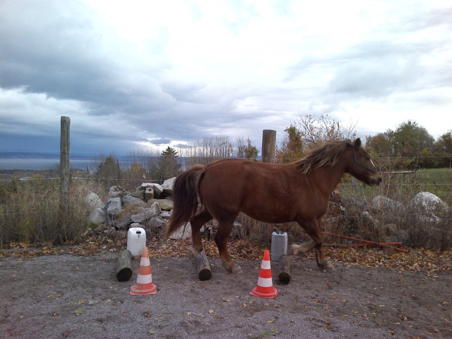 J'ai profité du "beau temps" ce matin (il ne pleuvait pas ) d'aller voir Mia . Les chasseurs aussi profitait du beau temps alors on a joué un peu dans le rond de longe (ça change après tout) puis ça la fait bouger un peu quand même puis c'est doux pour les pieds quoiqu'un peu abrasif .