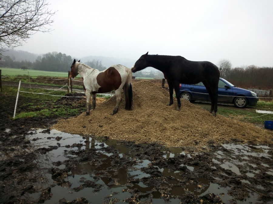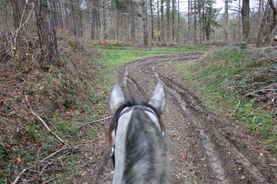 Après une longue descente boueuse à travers bois, quelques glissades et récriminations, maints petits galops sur les zones plates rencontrées sur ce sentier tout fait d'herbes, Salbai est repassé au pas.
