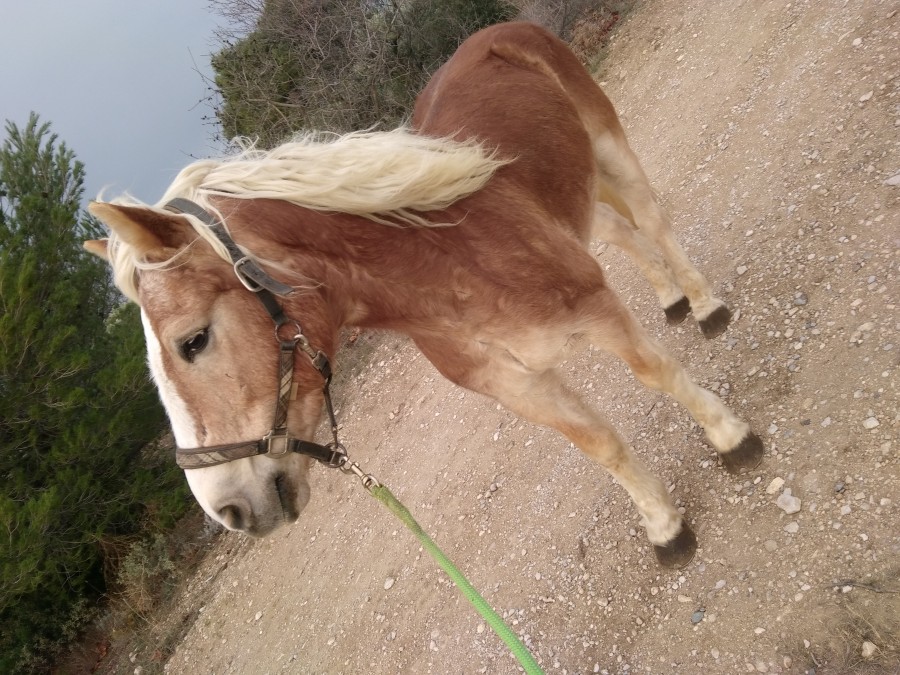 j'ai chaussé les antérieurs ( les hippo des postérieurs ont lâché, faut que je voie si c'est réparable peut-être avec des rivets), c'était pas super agréable pour lui : le chemin dans les bois était si glissant, à un moment il a carrément refusé d'aller plus loin, et c'était pas de la rébellion, il avait peur de se vautrer ; je l'ai écouté et on y est allé à pied (en effet, vraiment casse-pipe)