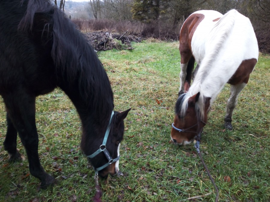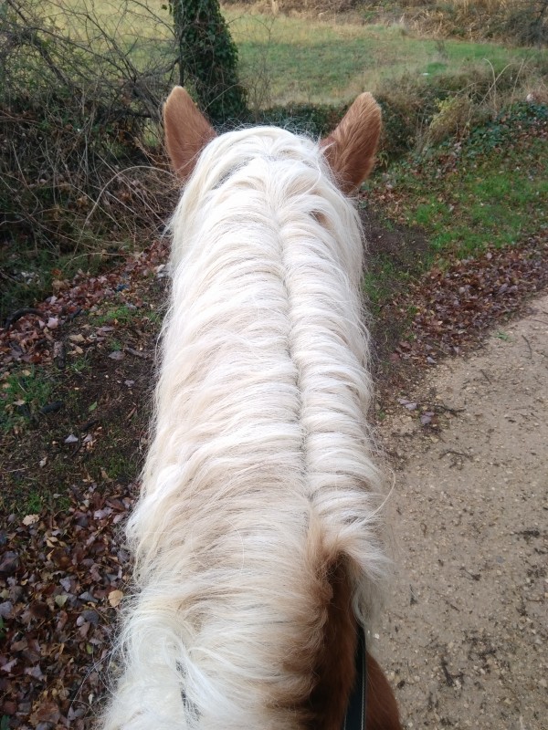 Bon moi je m'en fous, loin de me décourager je mets les licols, je donne un bout de pain et en avant !! Mon chéri était déjà moins serein. J'avais prévu une top balade et au début ça se passe pas trop mal