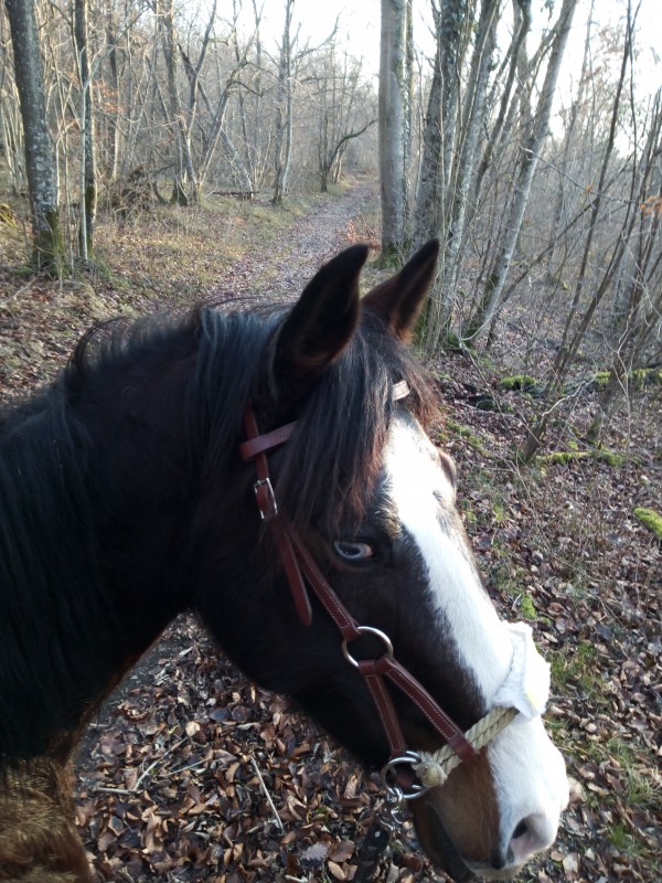 Une chouette sortie une fois parties, le premier km pas convaincue mais après elle a arrêté de se poser des questions. à un moment j'ai voulu couper un peu mais faut passer un contre haut, doit y avoir 1m quoi. Avec Velours j'aurais même pas tenté mais elle, je me suis dit, je la mets devant, si elle veut pas j'insisterai pas. Elle a très vite pigé et hop pas froid aux yeux ma grosse ! Elle m'a sauté ça de l'arrêt, sans problème lol c'est moi qui ai été surprise (plus l'habitude et puis, y a du muscle là-dessous !! 100% trait faut pas l'oublier)