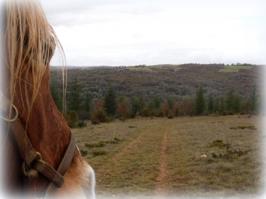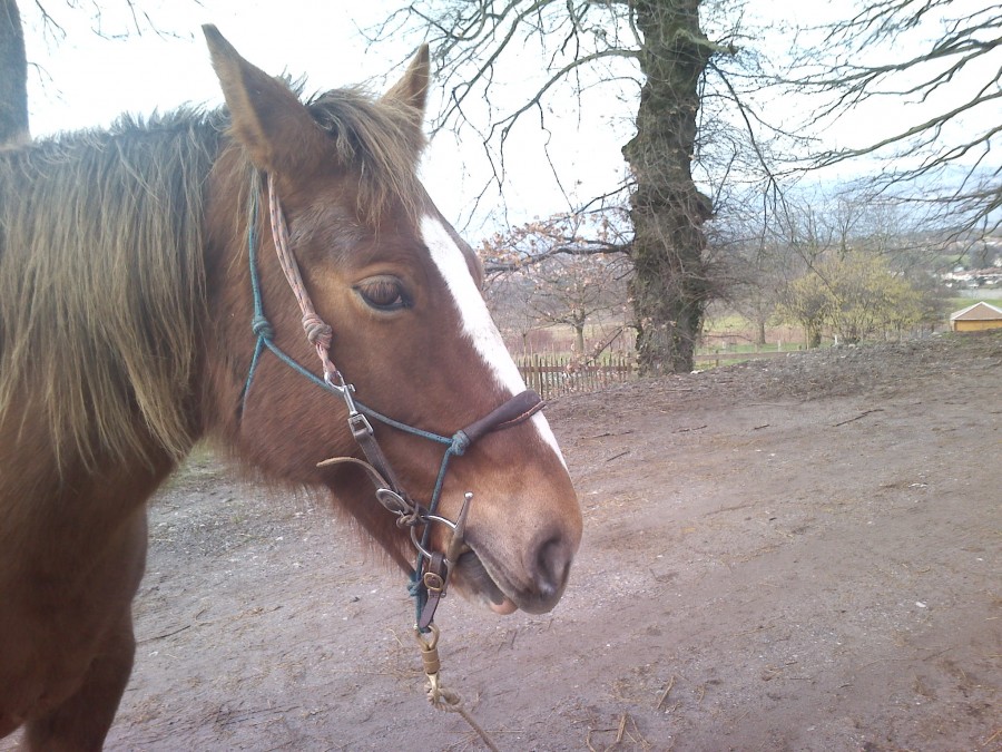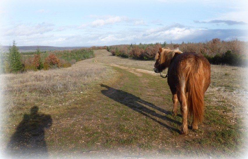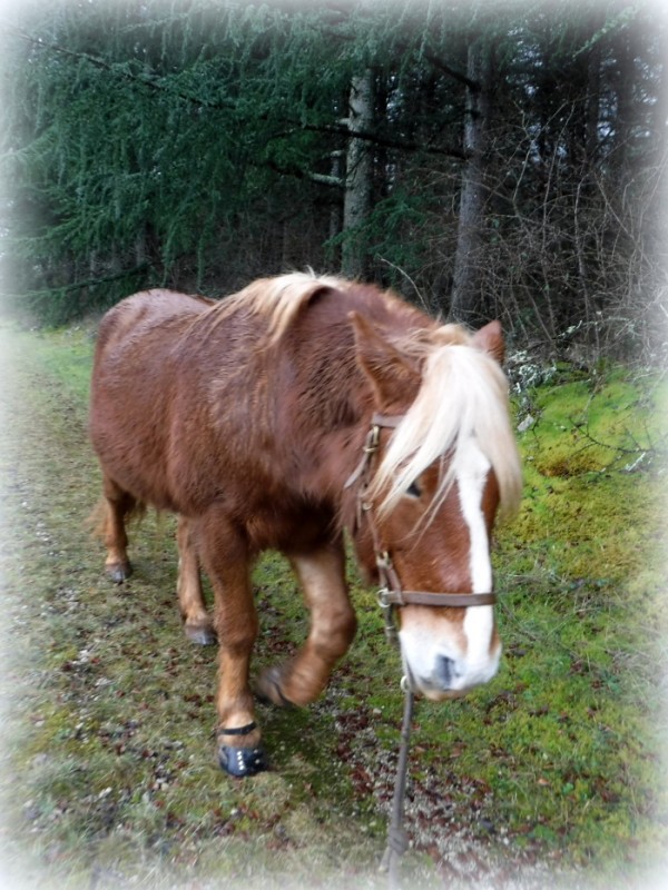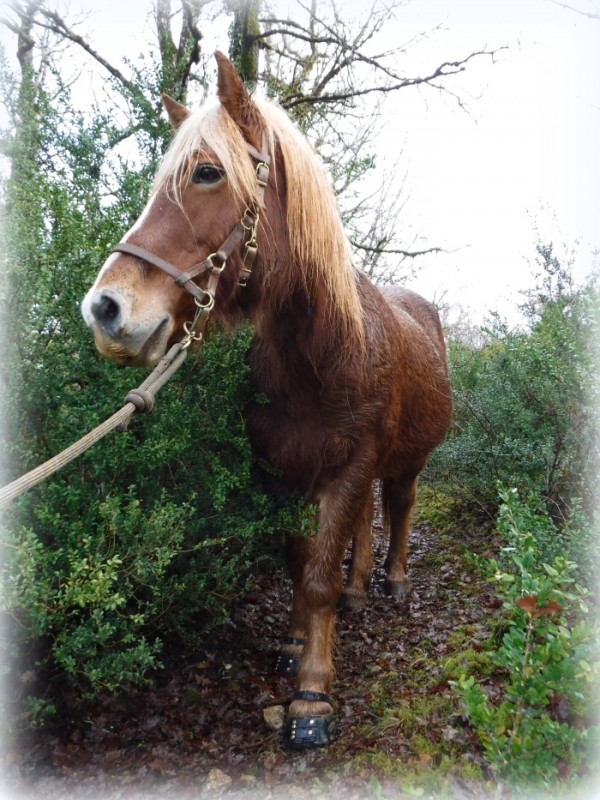 Aujourd'hui je lui ai mis les boots aux antérieurs, car la sortie de mercredi elle était pieds nus et en fin de balade je la trouvais encore plus sensible. Je n'ai pas envie de la dégouter. Le temps de décrotter ses pieds mettre les boots et on est parti.