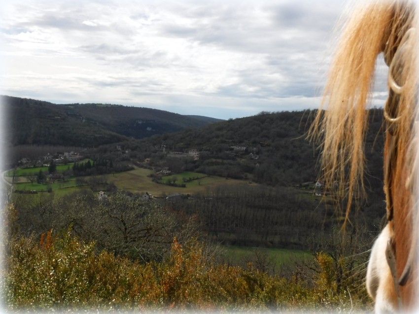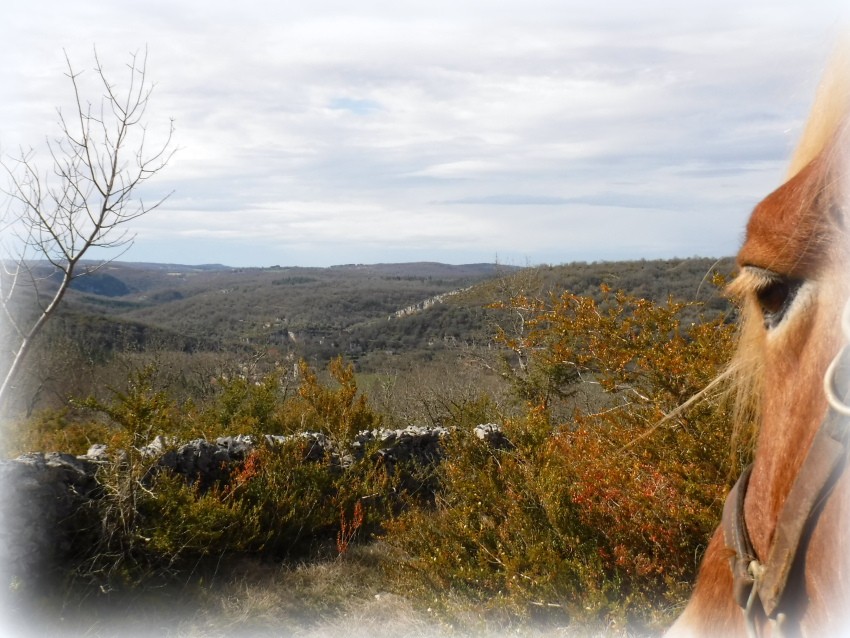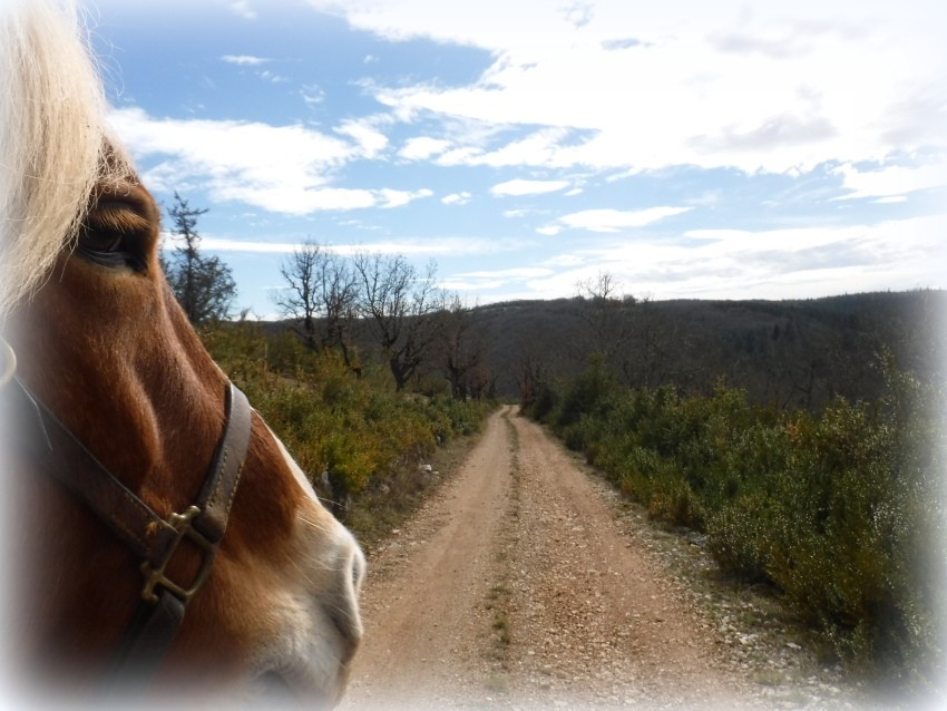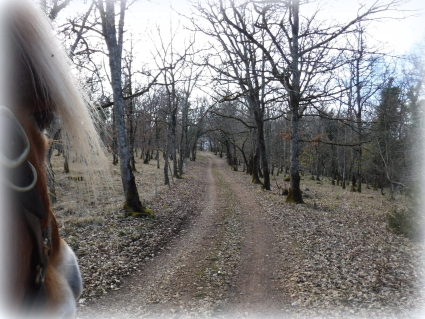 Donc encore sous l'effet de la peur et de la douleur, je repars sur un cheval complètement serein. On continue notre chemin, puis il me vole le trot, le vilain ! Puis je me dis, pourquoi pas ? Ca fait longtemps. Alors je le lance au trot, avec mon sac à dos absolument pas réglé (à cause du gilet airbag), c'était HYPER DESAGREABLE ! xD Ca a pas eu l'air de le déranger lui, et j'ai réussi à l'avoir au petit trot
