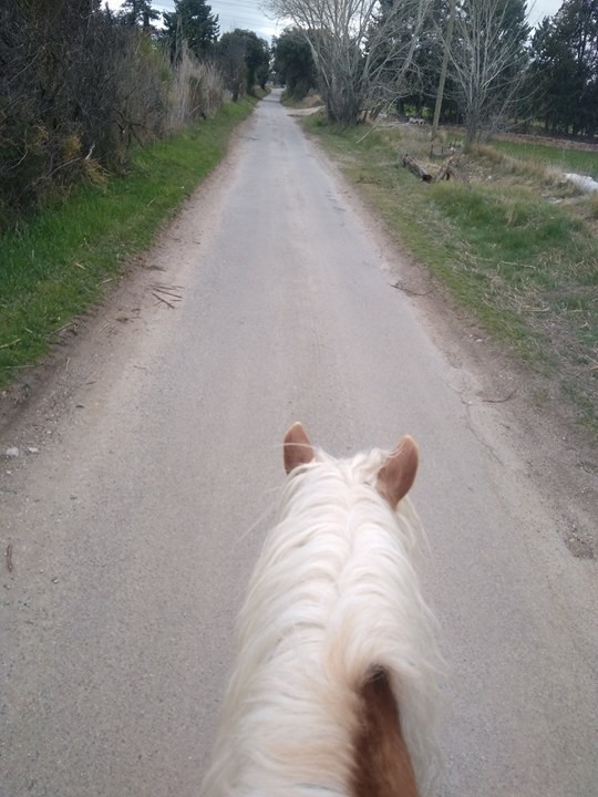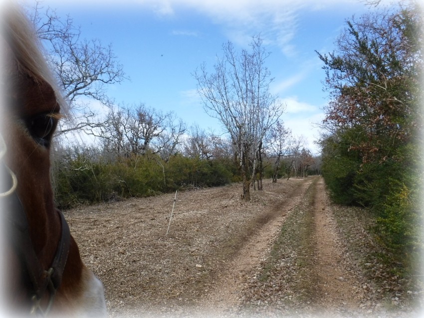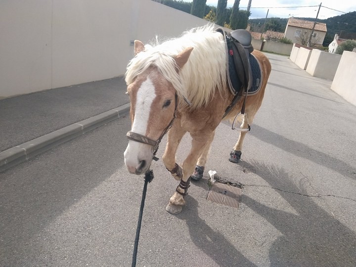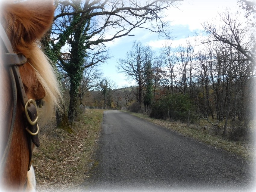 Elle nous a quittés au moment de passer sur la route... j'appréhendais un peu ce moment, vu qu'aux toutes premières balades, même en main, si le copain s'éloignait un peu il paniquait. Certes, j'étais pas inquiète à l'idée de longer la route (elle est droite, donc on nous voit de loin), mais dans cet état d'esprit...? Ben il a pas arrêté d'hennir, mais je l'ai trouvé très correct. Il ne faisait pas attention aux voitures au moins. On avait environ 300/400 mètres de route à faire. Je pense qu'il ne se rappelle même pas qu'on y soit passés !