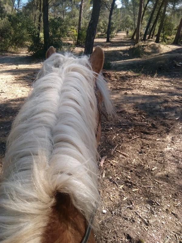 Enfin, du coup avec le vent, j'me dis qu'on va pas aller de l'autre côté de la route. Mais une fois sur son dos, malgré que je sois un peu anxieuse, il était complètement serein à 200%, du coup j'me suis dit "bon bah, go en forêt alors !"