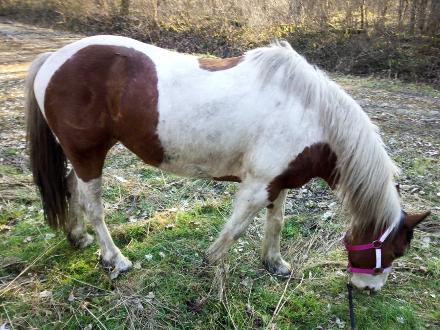 Ca faisait genre une micro-clairière au milieu du bois, c'était mignon comme tout, par contre j'ai complètement perdu son attention, il voulait pas rester à l'arrêt, j'me suis un peu fâchée mais quand je me suis fâchée, j'ai compris que ça servait à rien d'insister, donc j'ai laissé tomber et on a fait demi-tour parce que le chemin après était plein de plaques, pas forcément glissantes mais j'avais pas envie de prendre de risques.