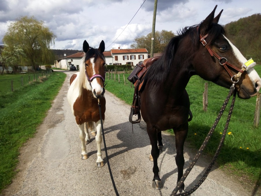 Je pense que j'ai voulu faire trop d'un coup ... Ben oui, 5 semaines à voir son boxe et le manège, même si la veille nous sommes sortis 10-15minutes en forêt, 40 minutes c'était trop (en plus ils ont mené au fumier toute la journée au CE, de l'agitation dans tous les coins). Surtout qu'il n'a pas un fond méchant, je pense que le trop plein d'énergie est sorti d'un coup, il y avait des prés à perte de vue... L'ennuyant, c'est qu'à l'écurie, il n'avance plus, il ne veut plus marcher, il s'ennuie. Bon ce soir on rechange d'écurie, ça va lui faire du bien de changer d'endroit.