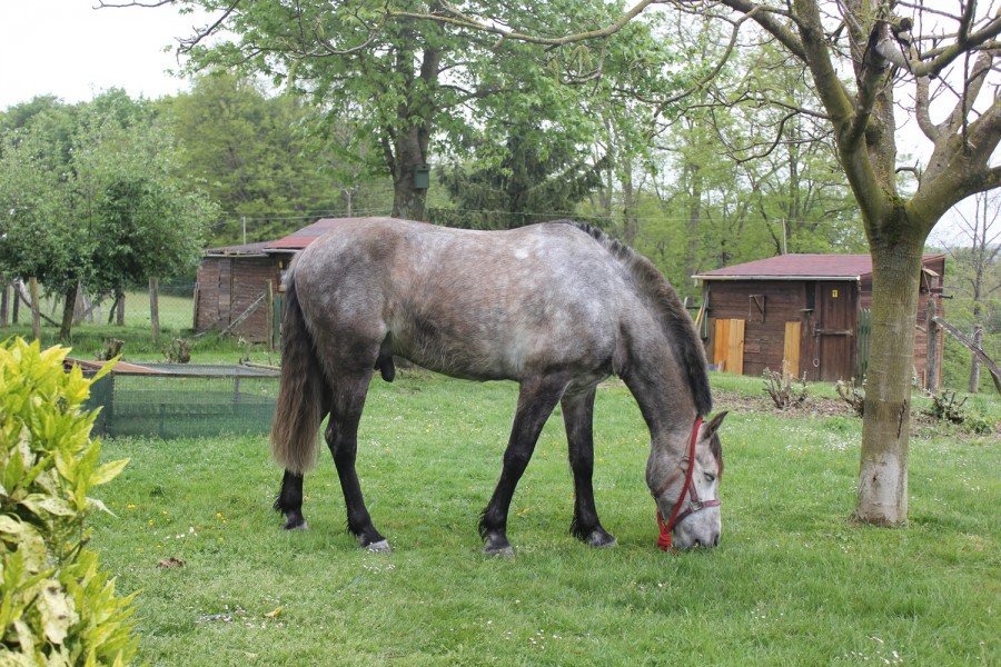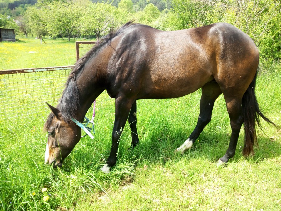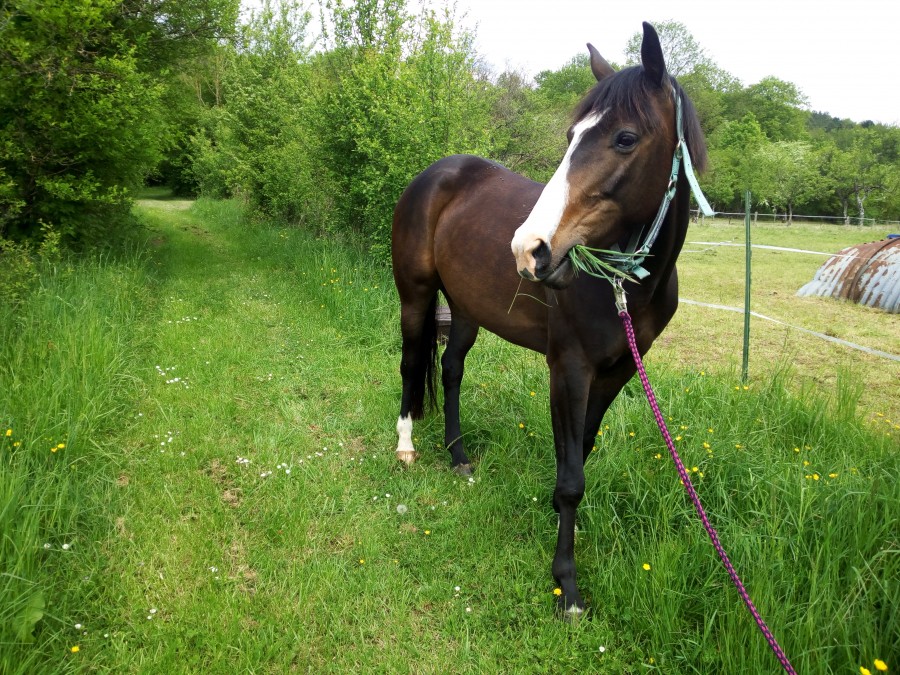 De toute façon, même sans podo, Salbai se porte très bien, il n'y a que moi qui me pose des questions. Sa maldresse lui passera simplement avec l'âge. Déjà, après un an au pré, il a des rapports beaucoup plus normaux avec les poneys et stresse beaucoup moins. Je pense qu'il peut encore beaucoup en apprendre.