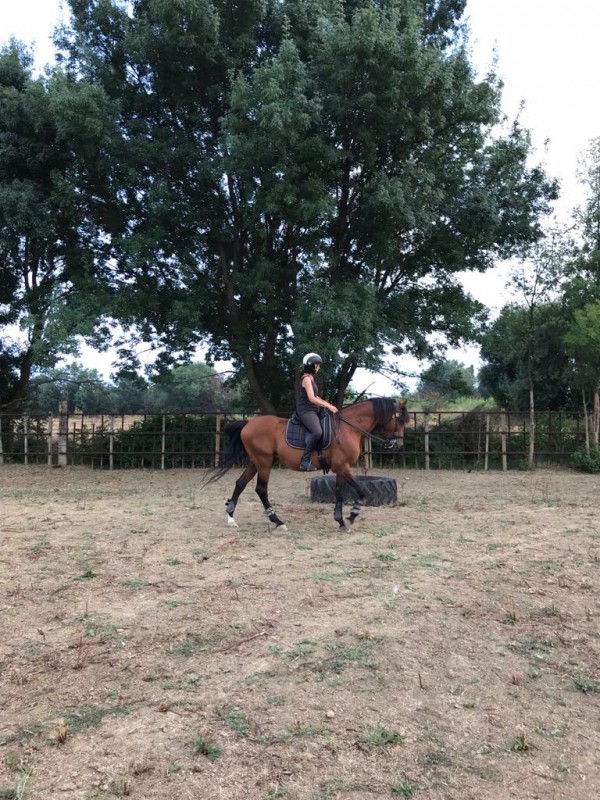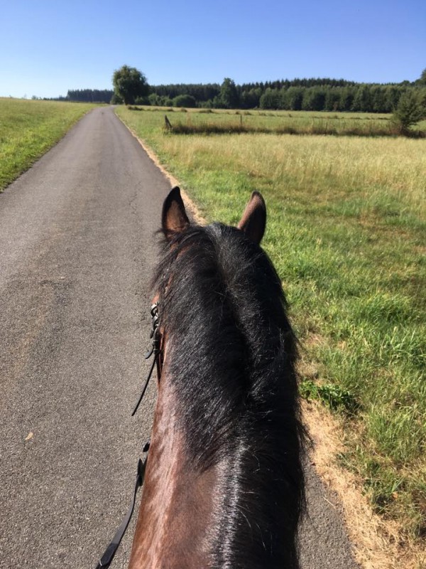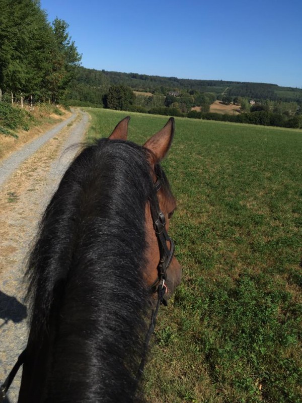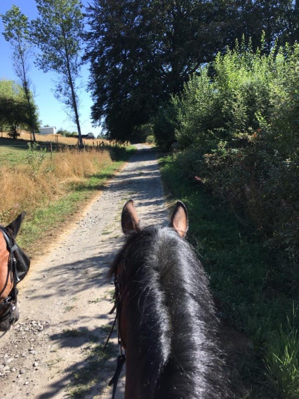 En plus il ne veut plus voir le manège ou la carrière en peinture, il fait trop chaud, donc il a aucune envie de travailler. Du coup je suis contente qu'on trouve des moyens de continuer à progresser en extérieur, et j'ai hâte qu'on puisse rebosser en cours.
