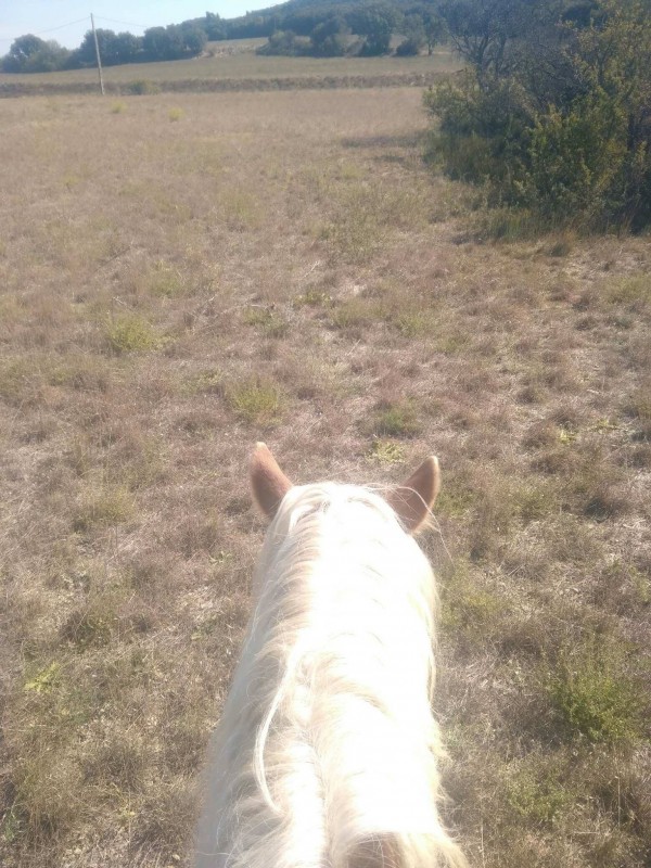 On arrive à la départementale, y'a un chemin génial qui la "longe" (bon, c'est éloigné quand même), on se fait un galop, c'était génial, un sol sympa, une ligne """droite""", un cheval trop heureux, c'était trop trop bien. On arrive au champ, et je pense tout bêtement "bon sang, un p'tit galop ici" et hop, les oreilles en avant, prêt à en découdre ! Mais bon, j'ai voulu le préserver donc j'ai pas fait.