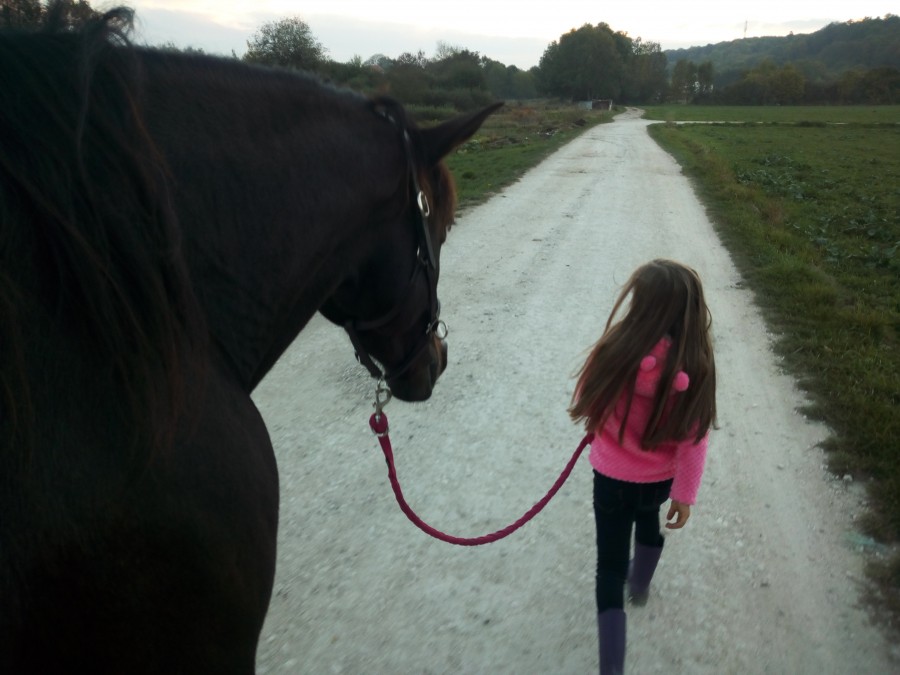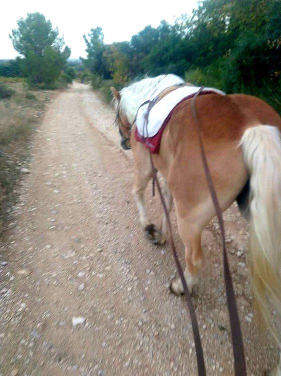 Bref , on est parti avec une poulinière pour une balade de ..... 2 km en main . Je me suis rendue compte que quand la jument faisait une foulée , Salty en faisait 2 . Il fait vraiment des mini foulées .... il me semblait qu avant c était une peu mieux , mais peut être que c était qu une impression , ou alors c est le temps qu îl se remette .