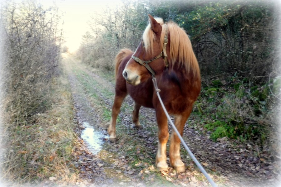 En arrivant sur un Des grand chemins, j'en vois un petit dans les sous bois. Donc je l'ai tenter. Sauf que j'ai vite regretter, le terrain était horrible et on s'enfonçait de plus en plus, au bout on arrive enfin vers un chemin, mais en faite c'est une parallèle. Du coup je laisse poney choisir où on va. Elle prend à droite et encore à droite. On c'est encore enfoncé dans les sous bois, et terrain pourri de chez pourri, des branches partout. Mais elle y est aller d'elle même, donc contente de sa franchise.