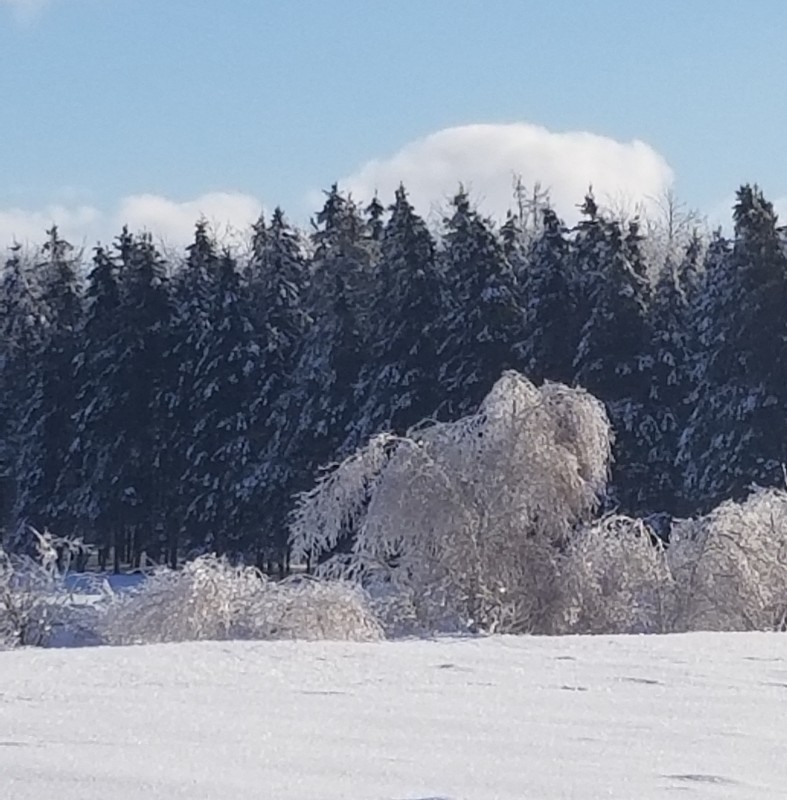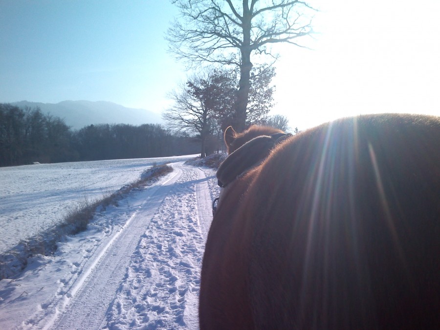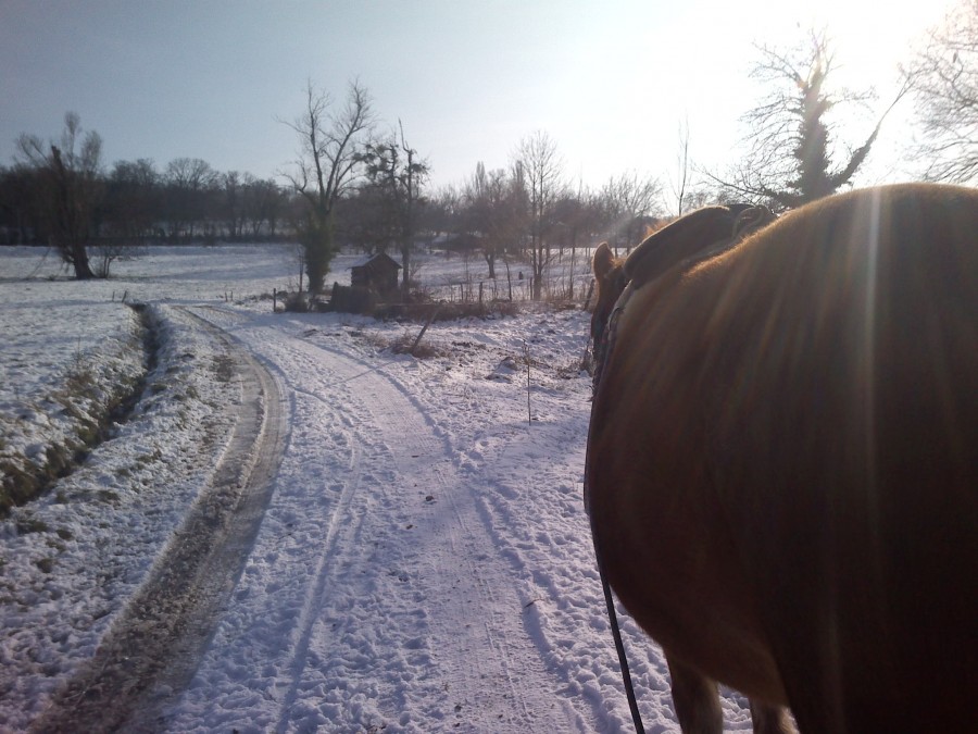 Aujourd'hui on a fait un grand tour en LR pour voir comment sont les chemins ,j'avais mis les boots qu'aux anterieurs ; on a fait des parties de routes dont qqs unes encore un peu verglacées puis qqs chemin en neige donc plus "doux" pour les pieds !! J'etais content d'avoir un cheval sans fers !! Mais j'etais contente d'être à pied à certains endroits ....Faudrait que je prenne mais rênes de rando pour faire des bouts à cru . On n'a pas croisé d'autres chevaux je pense qu'ils ne sortent pas quand il y a de la neige !!