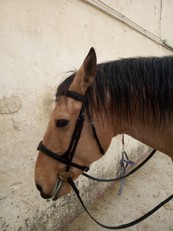 Et puisque qu hier il a été très bien en filet , en balade on a viré le Pelham droit portugais et on a mis un goyo ( je ne suis pas encore pour prête pour le mors a olive dehors ) .
