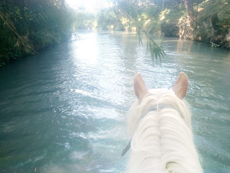 Il adore faire le trajet à contre-courant, sachant que le courant est tellement fort que je me fais limite emporter... lui il est content, il marche comme si de rien n'était ! Je crois que ça me fatigue davantage moi parce que je dois pas me casser la binette et que mes jambes se retrouvent sur ses fesses. C'est notre plaisir quoi, au frais, sans stress... puis comme ça il bosse un peu, parce qu'il fout plus grand chose comparé à avant.