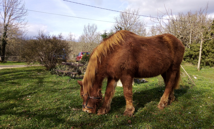 Les chemins sont ultra caillouteux, on le savait, mais franchement jusqu'ici je trouve qu'ils gèrent très bien ; ils ne sont là que depuis 2 semaines, et ils y vont sans douleur. Bien sûr ils ralentissent sur les pierriers mais n'importe quel cheval ferait attention où il pose les sabots là-dessus, à moins d'être un mulet !