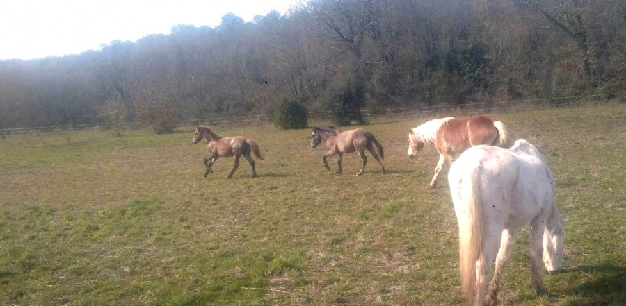 Je vous lis mais je n'ai pas tellement partagé nos récentes aventures. On commence à découvrir le coin, à pied et en selle, et à explorer les chemins. Pour l'instant les chevaux se comportent très bien, comme si les pistes étaient plus naturelles pour eux. C'est assez curieux, il leur a fallu très peu de temps pour être zen. Ils n'ont fait aucune difficulté à l'attache par exemple, alors que dans la pension précédente, ils ont bien mis 3 semaines à apprivoiser les lieux. Simbad respecte les clôtures (en même temps le jus est très fort et les rubans sont de la sanglière... là, il est tombé sur un os !), Sinji sort seul sans difficulté jusqu'ici, Simbad est plus angoissé mais ça va revenir.