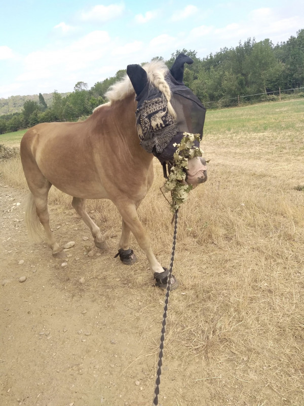 Je suis très contente de ma jument qui a été exemplaire tout du long : calme en toutes circonstances, volontaire mais pas trop rapide, aux ordres (j'ai enlevé le Hackhamor dès le deuxième jour tellement elle était parfaite) et ne bronchait pas quand je montais depuis la droite (avec élégance et légèreté évidemment