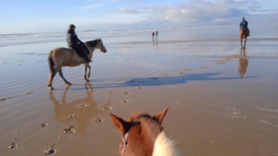 Hier était prévu une sortie plage, du coup je me suis laissée tentée avec nounouch. 3 grands chevaux de complet dont une monitrice qui ont fait leur entraînement cardio. Et ma copine avait emprunté un poney "assurance vie" d'un club.