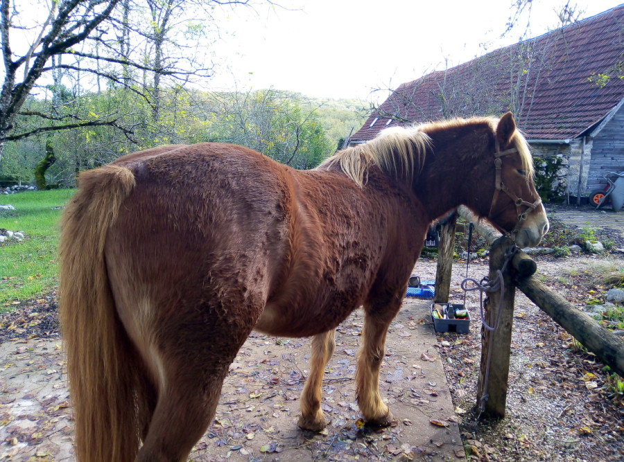 Noa Daineger, cheval français de selle de 2001, atteint d'un cushing. (la bai sur les photos).