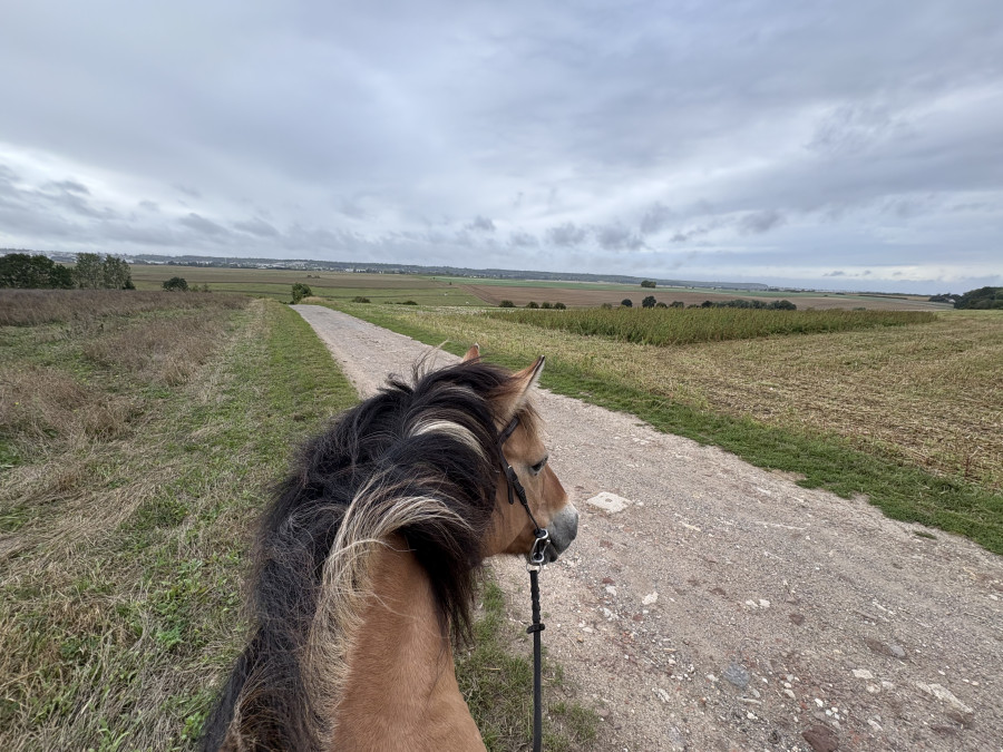 Bon pansage et nous sommes parties. J’ai voulu refaire le même chemin que dimanche dernier. Je l’ai trouvé très observateur, sans pour autant être sur l’œil, donc c’est très bien. Nous sommes allés dans la plaine, donc pas trop d’arbres pour masquer le vent. Il s’est très bien comporté !