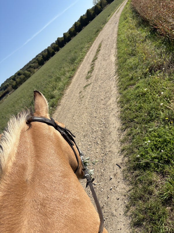 Donc on est partis en balade. On a pris un chemin qu’on connaît mais dans l’autre sens, puis on a tournicoté en prenant divers chemins. Au final, entre la balade et les pauses brout-brout, on est partis 2h ! J’ai pu faire un peu de sans étriers, mais j’ai trouvé ça moins bien que d’habitude. Je me tenais moins droite. Bon, moins top ma position. Par contre, j'ai tenté de fermer mes yeux au trot sans étriers, c'est particulier, les sensations sont démultipliées !