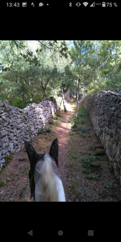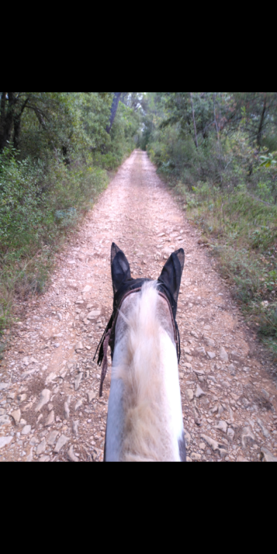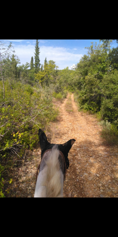 Sur la dernière portion je lui ai demandé de galoper et elle m'a donné un beau galop bien cadencé. On m'a toujours dit que ce n'était pas bien de les galoper dans le sens retour, mais, perso, mes juments sont suffisamment à l'écoute et n'embarquent pas. En tout cas je n'ai jamais de mal à les faire redescendre à l'allure inférieure quelque soit le sens dans lequel on va.