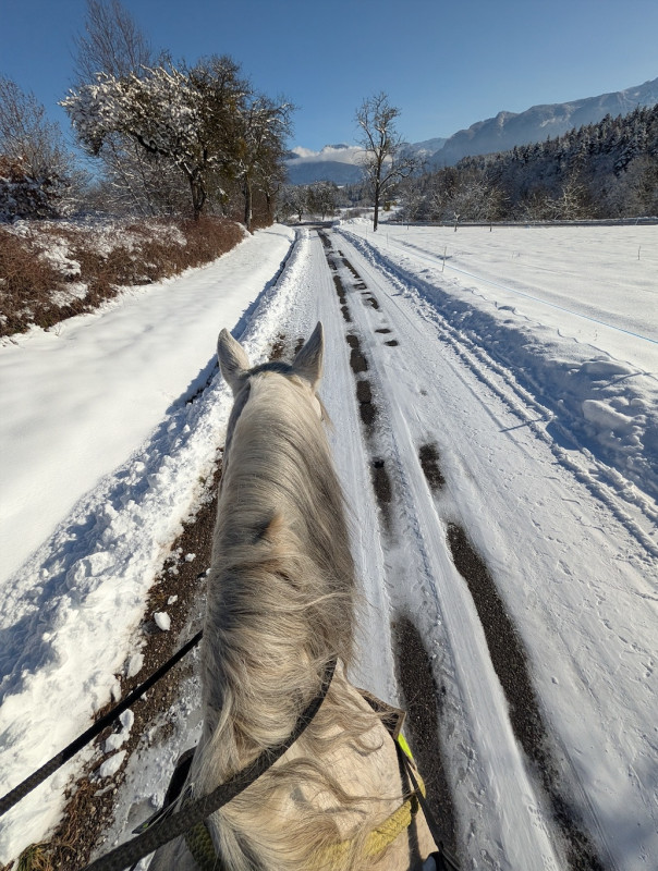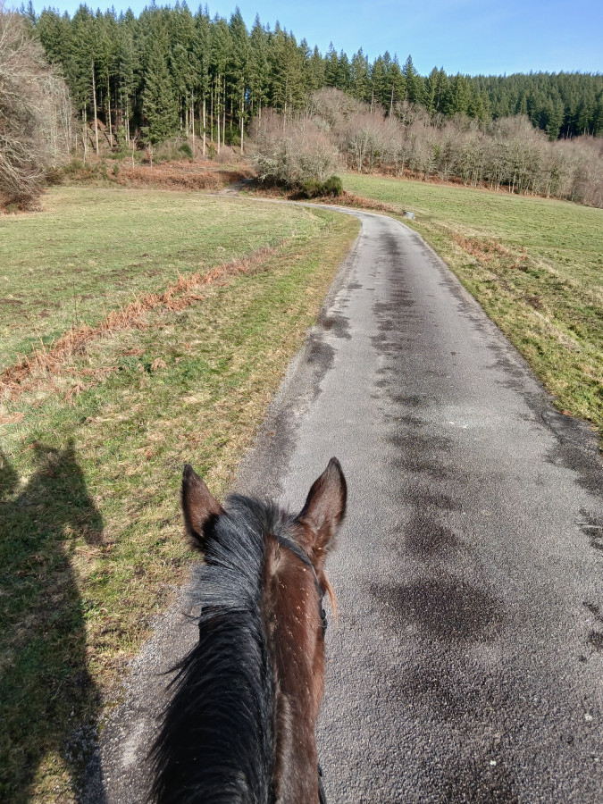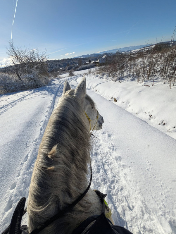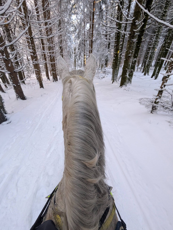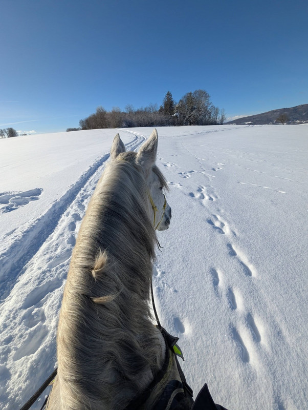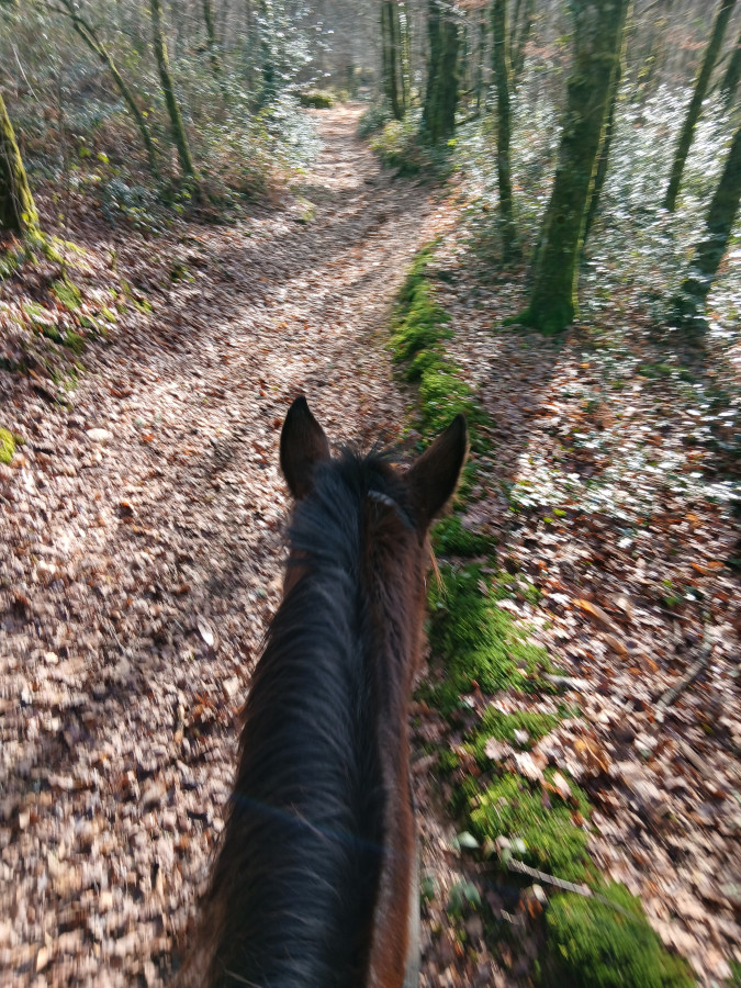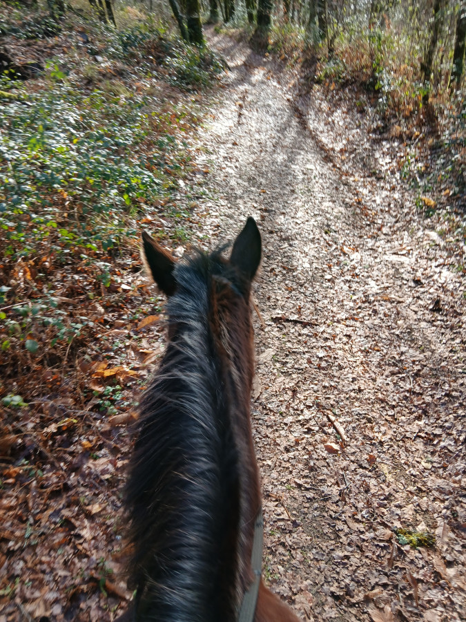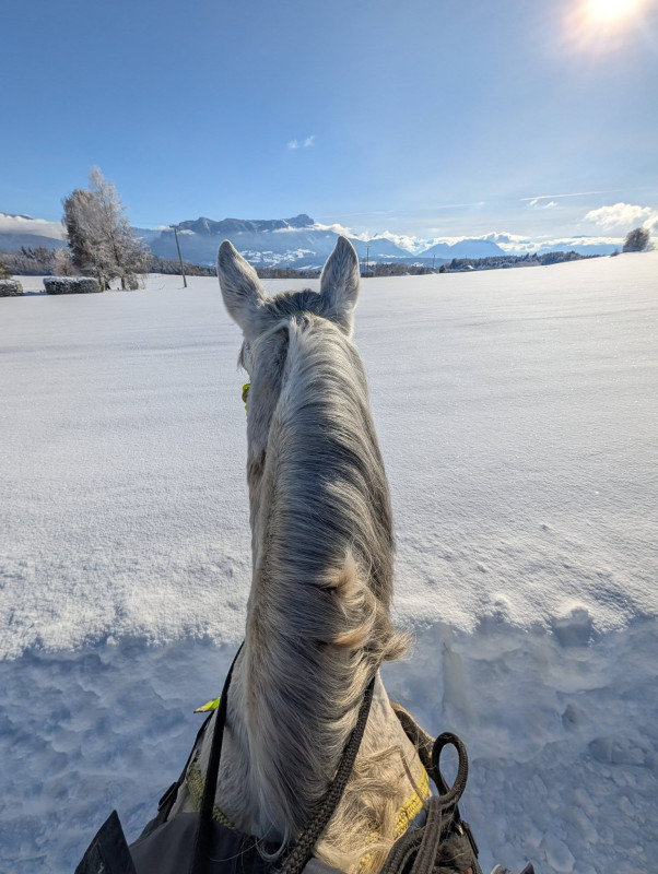 C'est hyper frustrant surtout que j'ai des horaires qui me permettent de monter hyper facilement le soir en semaine (je finis à 16h30 tous les jours) mais l'hiver ce n'est pas possible. Et le week-end, on a souvent beaucoup de choses de prévues auxquelles s'ajoutent la chasse (on ne part pas quand il y en a), la météo et le fait que je ne peux pas monter trop tard pour lui laisser le temps de sécher correctement avant de remettre sa couverture le soir. Il n’est pas tondu et n’a pas énormément de poil, mais je n’échappe pas aux zones humides au passage de sangle, aux épaules et à l’encolure.