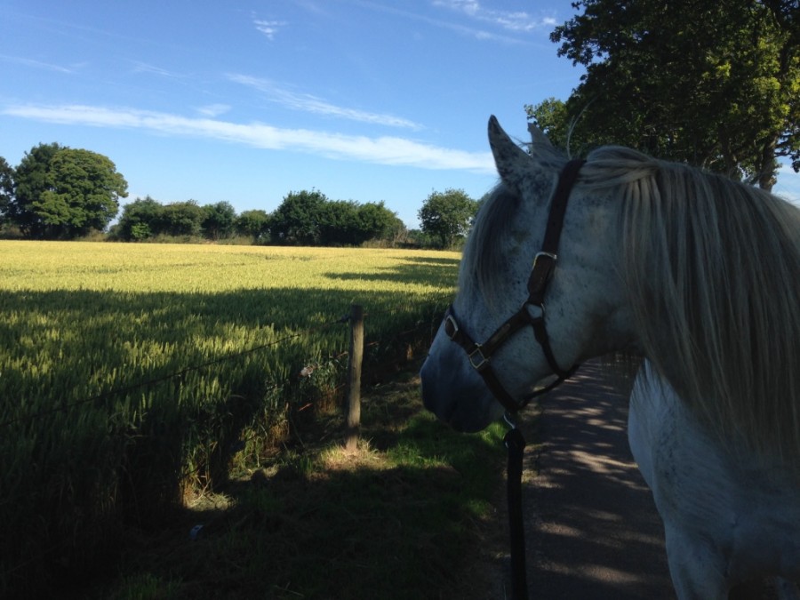 Tout est prêt, nous voilà partis, à pieds d'abord, entre le Ranch Occitan et Pierrelance, il y a un bout de route, et c'est profitable à Beau et Mien, son oeil, inquiet du début, s'apaise au fil des mètres. Il ne regarde pas grand chose, ni la moissonneuse-batteuse du champ d'à côté, ni les voitures, ou autres trucs, sauf peut être quelques souches au bord d'un chemin. Il a le même pas actif que sa mère, j'adore ses chevaux qui se bougent au pas. Sèb lui, aimerait bien que Jitane ralentisse un peu, il a du mal à la gérer la bestiole à pied! Beau et mien marche pareil.. même sur mon pied!