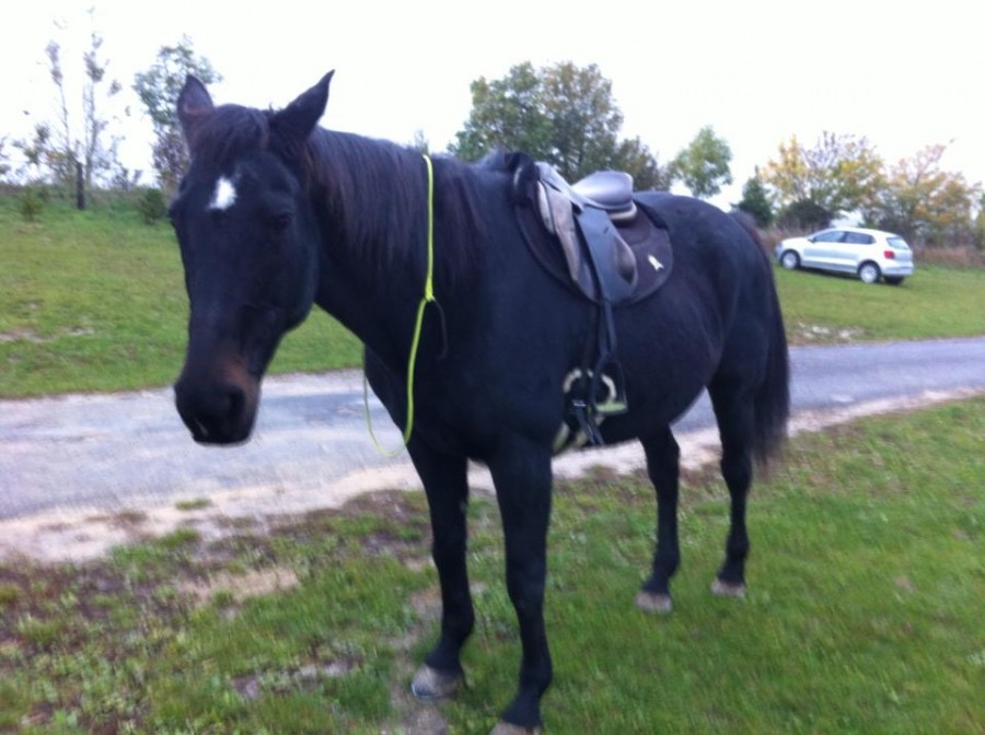 Mon cheval, comme toujours, un vrai charme! Mais la jument d'une amie a décidé qu'elle ne voulait pas passer. Elle a toujours hésité à passer là mais elle finissait toujours par passer. Jeudi, elle a complèment bloqué. On est resté là pendant 1 heure! On ne voulait pas la laisser contourner la branche, elle est capable de la passer, elle l'a fait souvent....Bref, on a finit par la faire passer en lui passant manuellement les 4 jambes au-dessus de la branch